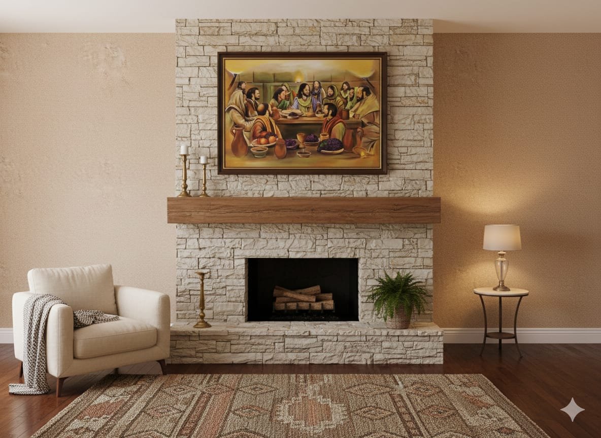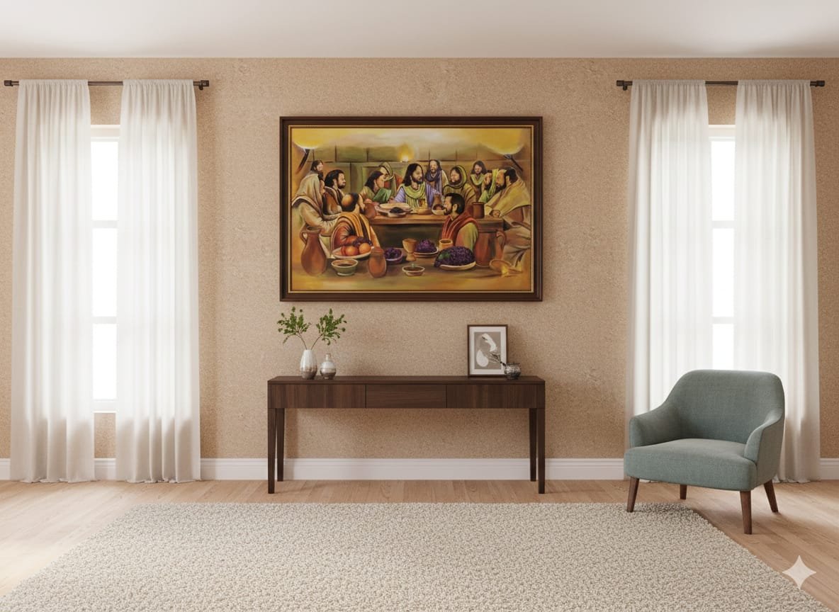 This mural beautifully portrays The Last Supper, capturing the sacred moment of unity, devotion, and divine promise shared by Jesus Christ and His disciples. Rendered in warm, earthy tones, the composition draws the viewer into an intimate gathering around the table, where expressions and gestures convey faith, reflection, and spiritual depth. The carefully balanced arrangement, traditional attire, and symbolic elements such as bread, wine, and grapes emphasize themes of sacrifice, communion, and love. This artwork serves as a powerful spiritual centerpiece, making it ideal for churches, prayer halls, religious institutions, or spaces seeking a timeless expression of Christian faith and heritage