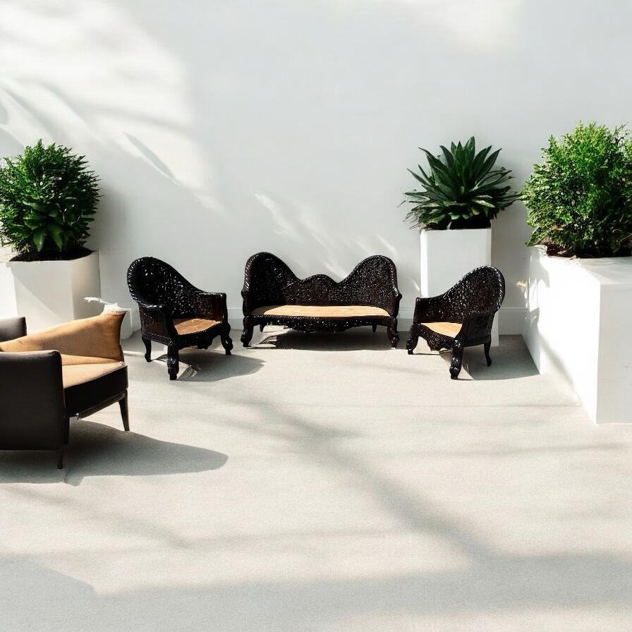 A stylish and comfortable wooden sofa with seating for five, combining durability with classic design.
