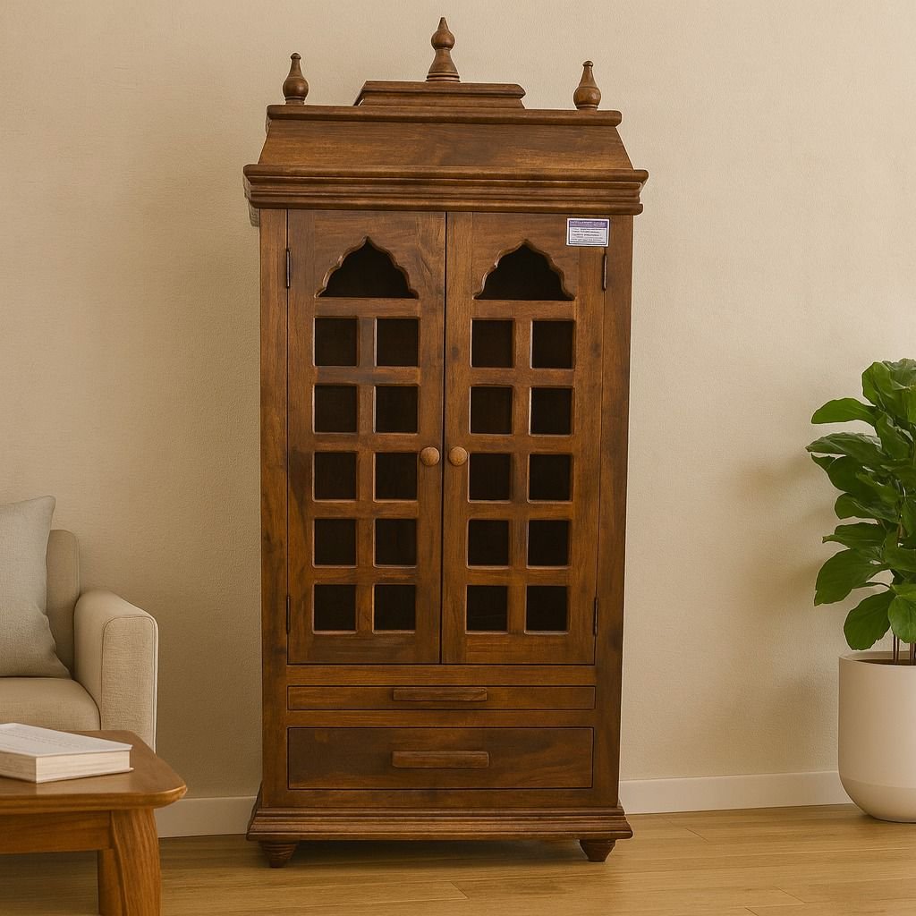 Crafted from premium solid wood, this elegant home temple brings a touch of tradition and spirituality to your living space. Its robust construction ensures durability, while the finely polished surface highlights the natural wood grain. Perfect for apartments, villas, or cozy corners, it offers ample space for idols, lamps, and other pooja essentials.