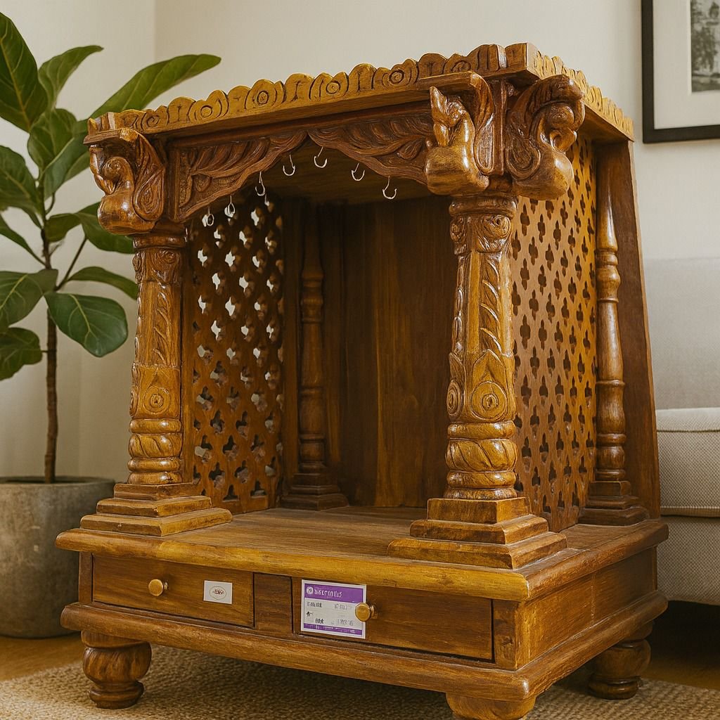 Expertly handcrafted with intricate carvings and a smooth polished finish, this wooden temple adds a divine and elegant presence to your home. Perfect for larger spaces, it reflects traditional craftsmanship and timeless beauty.